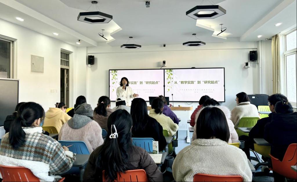 进入主讲环节,郑卉老师从自身教学实践与研究经历出发,以“中国教育如同一个成长中的孩子”为喻,指出教育发展过程中难免会遇到各种“小问题”,而研究生正如“初出茅庐的医生”,论文研究正是要发现这些“小伤口”,并开出具有实践意义的“小处方”。她以此鼓励同学们从真实教育场景出发,将问题意识转化为科研选题,让论文真正服务于教育改进。