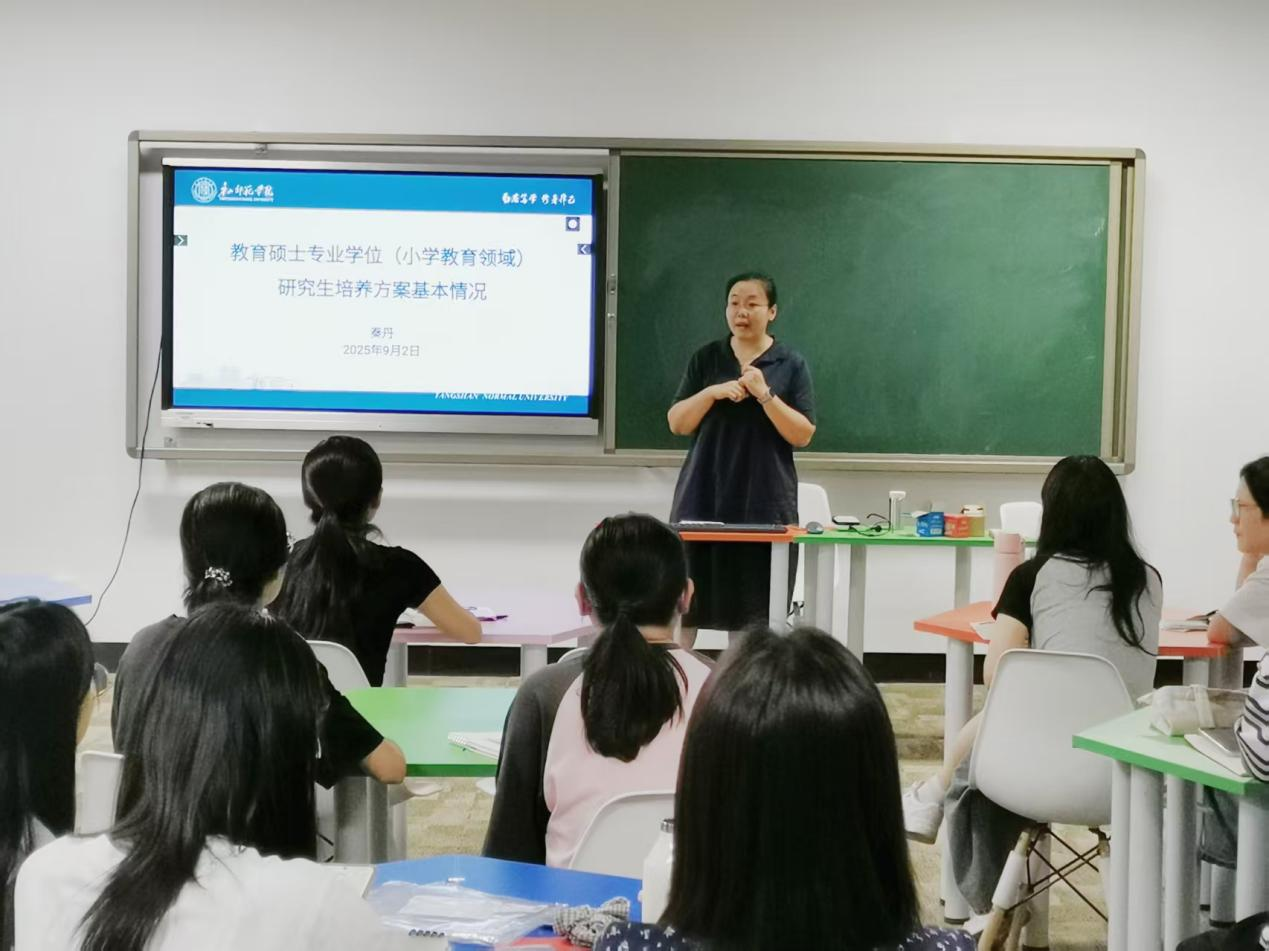 9月2日晚,秦丹院长对2025级小学教育领域研究生培养方案进行了细致解读,帮助同学们了解学习目标、课程体系、实践内容及学习方法,对如何顺利完成研究生期间的学习提出了意见和建议。