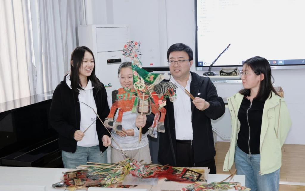 师生共同观看了《五锋会》《梁红玉击鼓战金兵》《鹤与龟》等经典剧目的影像资料。周学军先生结合视频内容,对剧情背景、角色特点及唱腔艺术进行了细致讲解。大家随剧情起伏,为忠义之举感动,为智勇之行振奋,亦在诙谐片段中会心一笑,透过屏幕依然深切感受到了皮影艺术的叙事魅力与精神内涵。在互动环节,学生们亲手执杆操控皮影,体验“光影造梦”的技艺魅力。从观看到参与,从了解到动手,同学们不仅增强了对非遗的感性认知,更在实践之中萌生传承文化的责任与自觉。