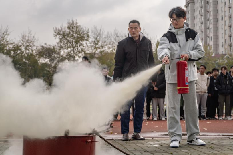 (杨长锁副院长指导学生使用灭火器。韩劭宣摄)